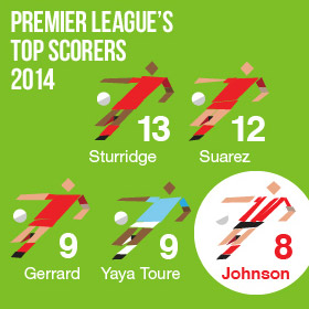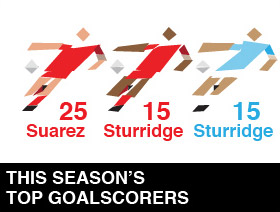 The top three goalscorers in this season's Premier League are currently: Suarez (25), Sturridge (18) and Aguero (15). Which three players are joint fourth? Suarez (25), Sturridge (18) and Aguero (15) |